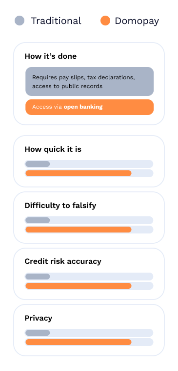 Domopay employs AI and open banking technologies to measure tenant’s affordability to pay rent: this online check is quick (you get the results in seconds), impossible to falsify, and is extremely accurate in predicting the tenant’s ability to pay rent on time.